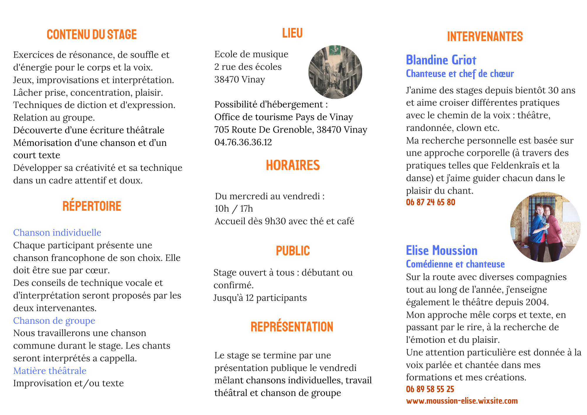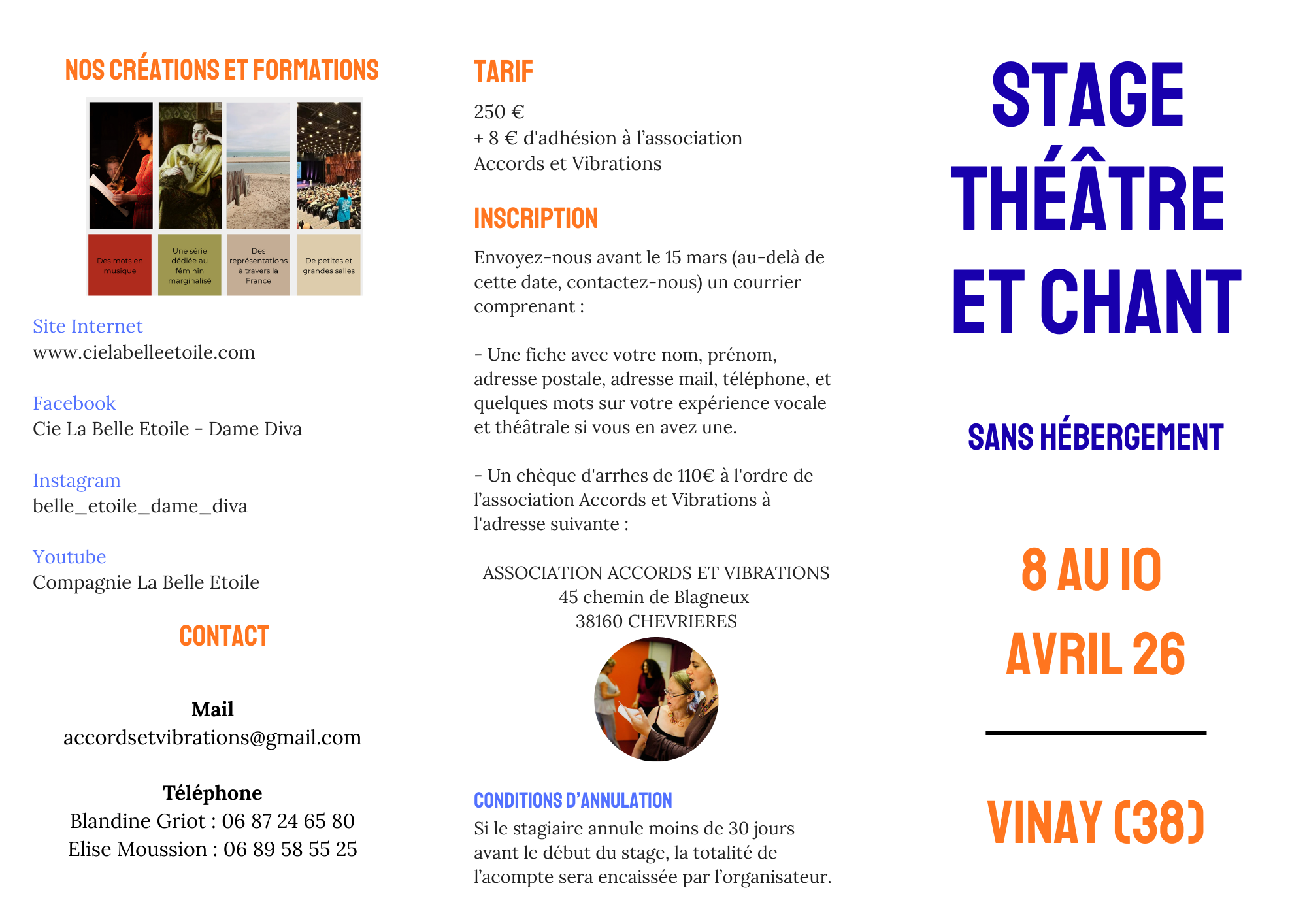 Nous proposons en duo des stages théâtre et chant ouverts à tous, ou auprès de groupes constitués tels que des choeurs.